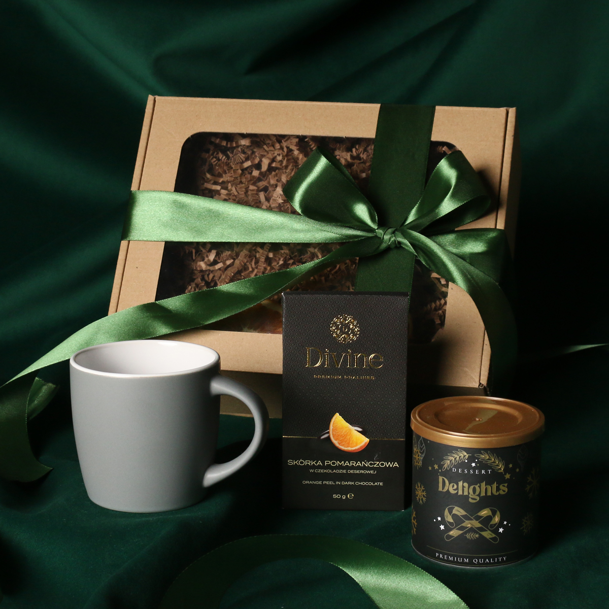 Il set comprende: Tazza Handy Velvet rosa pink-bianco / azzurro baby-bianco / Handy Cool grigio-bianco con possibilità di personalizzazione, Divine Pralines – mandorle al cioccolato con polvere di lampone (rosa) / mandorle al cioccolato con cocco (blu) / scorza d’arancia nel cioccolato fondente (grigio), Dessert Delights – ribes nero nel cioccolato bianco con polvere di lampone, confezionato in un tubo con motivo invernale. Il tutto confezionato in un elegante astuccio in cartone eco con finestra. Opzioni di personalizzazione aggiuntive: stampa sulla tazza, bigliettino con logo aziendale, nastro o fascetta con motivo invernale arricchito da dettagli dorati.