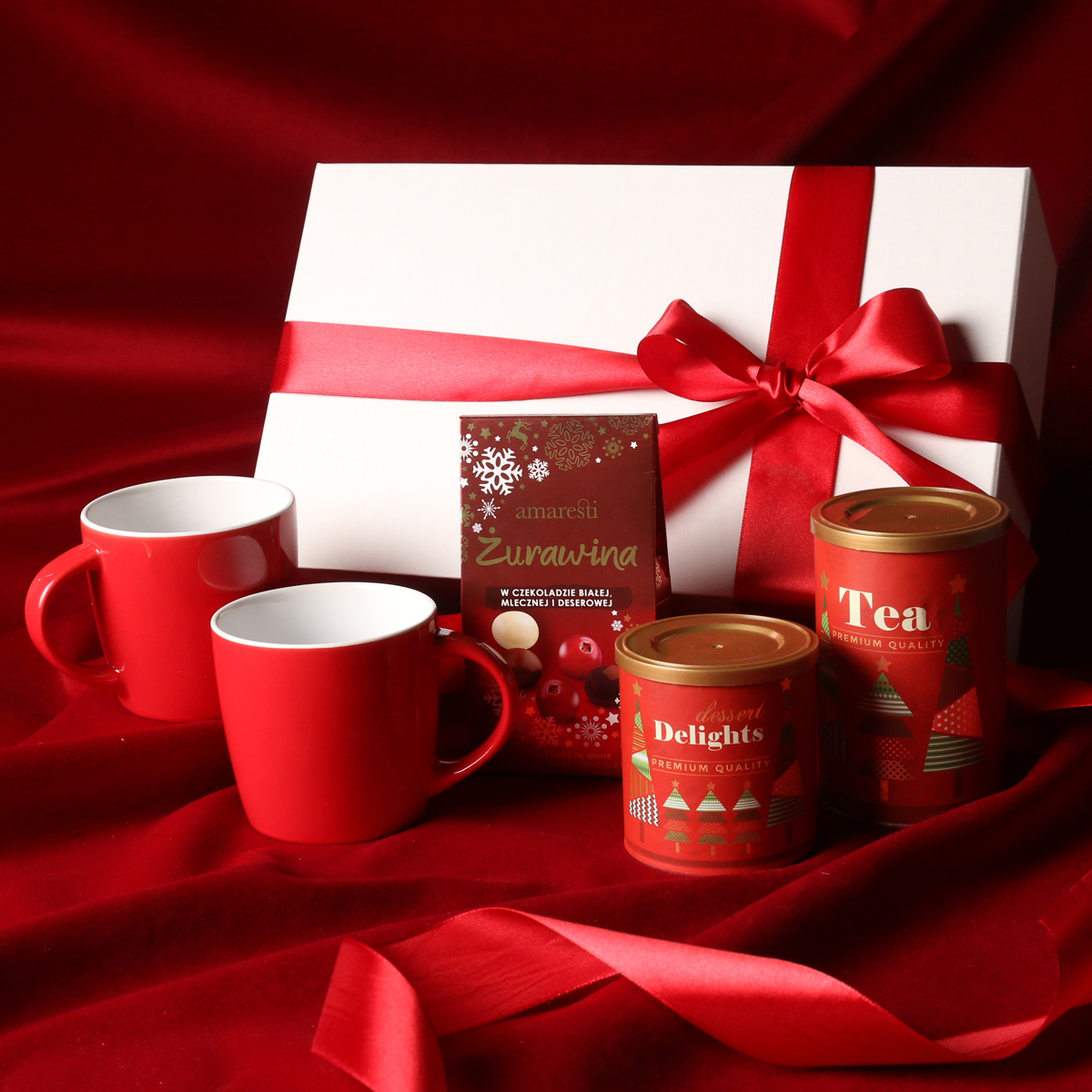 Tazze iconiche Handy in rosso Praline di mirtillo rosso in cioccolato bianco, al latte e fondente Praline Delicate Delights – ribes nero in cioccolato bianco con polvere di lampone 80g Tè verde aromatico Sencha con ciliegie, petali di rosa e foglie di ginkgo biloba 80g Confezione esclusiva con chiusura magnetica e possibilità di aggiungere nastro e fascetta coordinati
