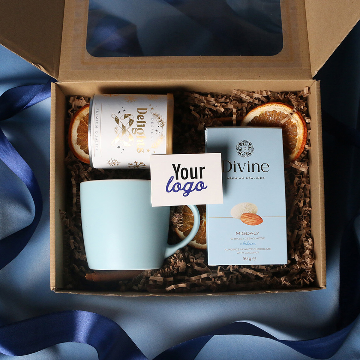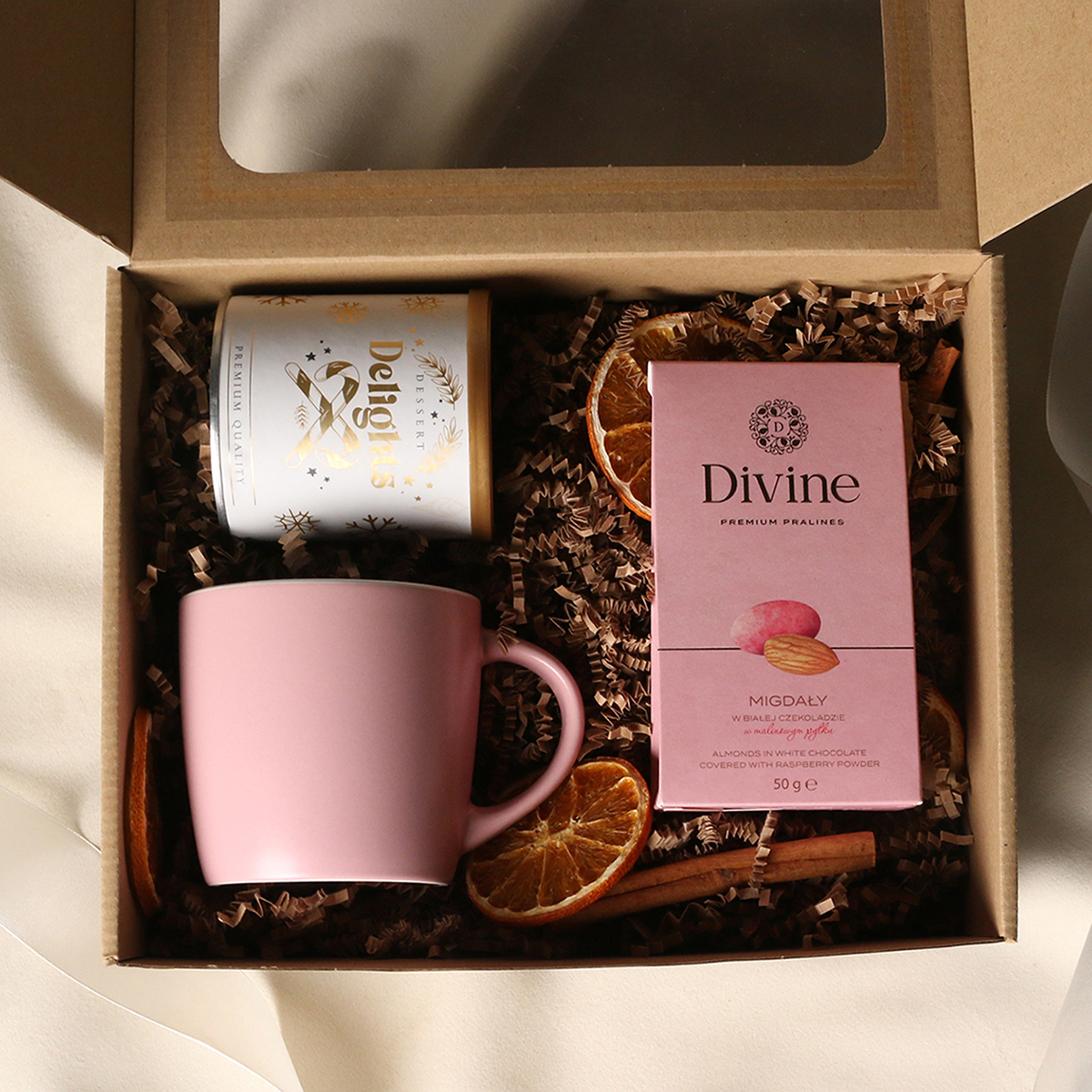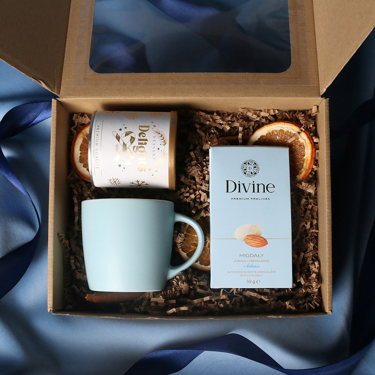 Il set comprende: Tazza Handy Velvet rosa pink-bianco / azzurro baby-bianco / Handy Cool grigio-bianco con possibilità di personalizzazione, Divine Pralines – mandorle al cioccolato con polvere di lampone (rosa) / mandorle al cioccolato con cocco (blu) / scorza d’arancia nel cioccolato fondente (grigio), Dessert Delights – ribes nero nel cioccolato bianco con polvere di lampone, confezionato in un tubo con motivo invernale. Il tutto confezionato in un elegante astuccio in cartone eco con finestra. Opzioni di personalizzazione aggiuntive: stampa sulla tazza, bigliettino con logo aziendale, nastro o fascetta con motivo invernale arricchito da dettagli dorati.