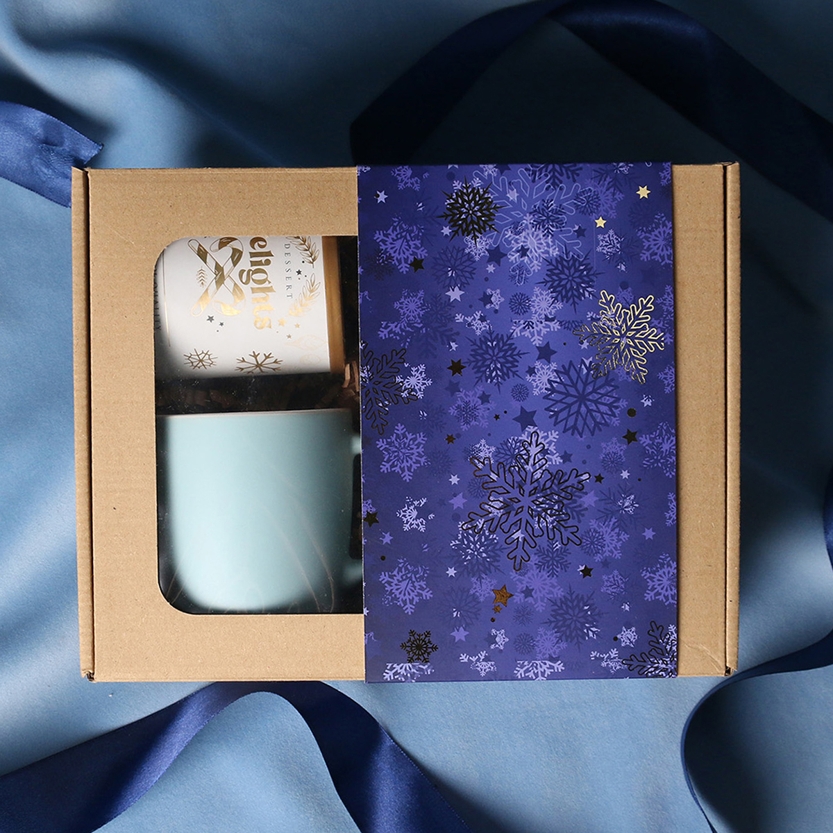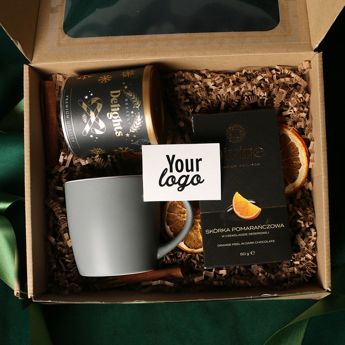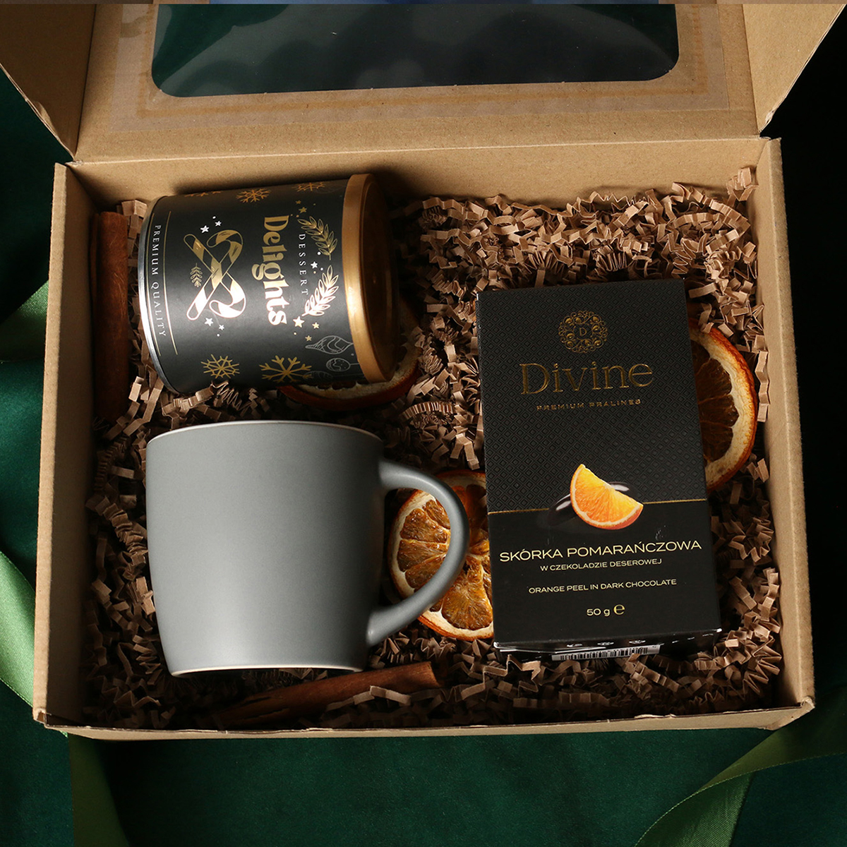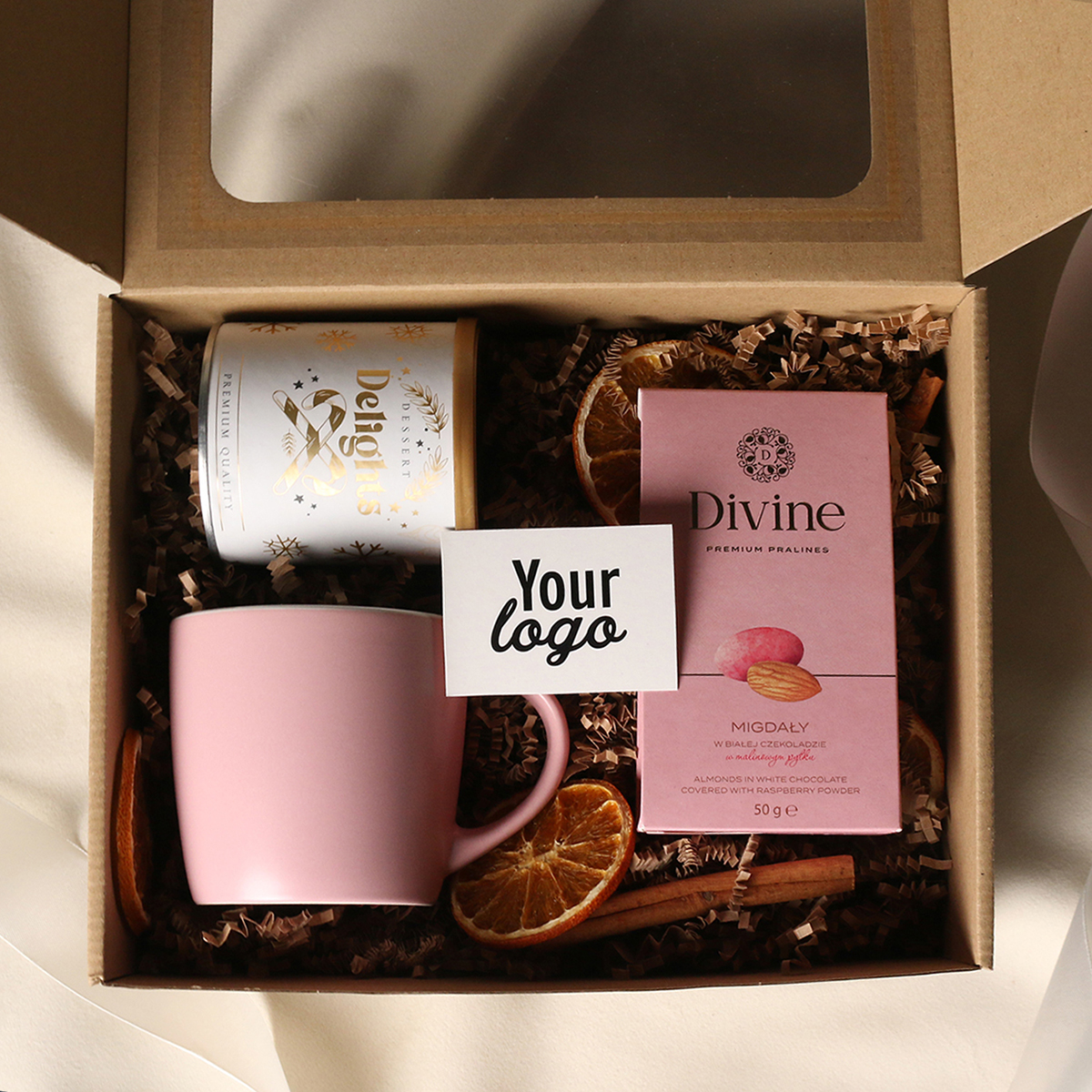 Il set comprende: Tazza Handy Velvet rosa pink-bianco / azzurro baby-bianco / Handy Cool grigio-bianco con possibilità di personalizzazione, Divine Pralines – mandorle al cioccolato con polvere di lampone (rosa) / mandorle al cioccolato con cocco (blu) / scorza d’arancia nel cioccolato fondente (grigio), Dessert Delights – ribes nero nel cioccolato bianco con polvere di lampone, confezionato in un tubo con motivo invernale. Il tutto confezionato in un elegante astuccio in cartone eco con finestra. Opzioni di personalizzazione aggiuntive: stampa sulla tazza, bigliettino con logo aziendale, nastro o fascetta con motivo invernale arricchito da dettagli dorati.