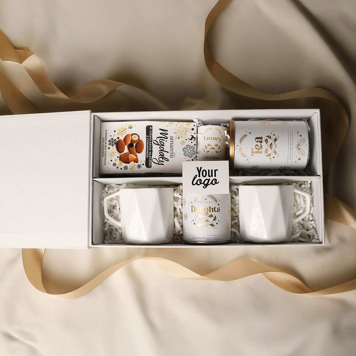 Tazze esclusive in porcellana Fine Bone China – Crown – 2 pz Mandorle dolci al cioccolato al latte con cannella Praline Delicate Delights – ribes nero in cioccolato bianco con polvere di lampone 80g Tè verde aromatico Sencha con ciliegie, petali di rosa e foglie di ginkgo biloba 80g Confezione esclusiva con chiusura magnetica e possibilità di aggiungere nastro e fascetta coordinati