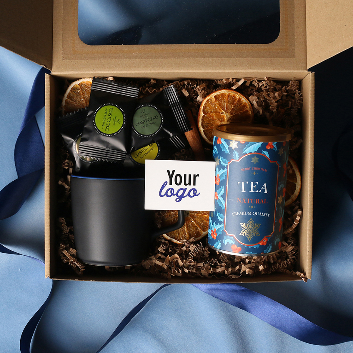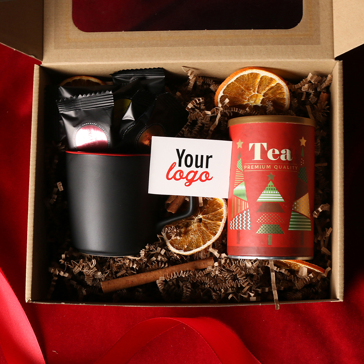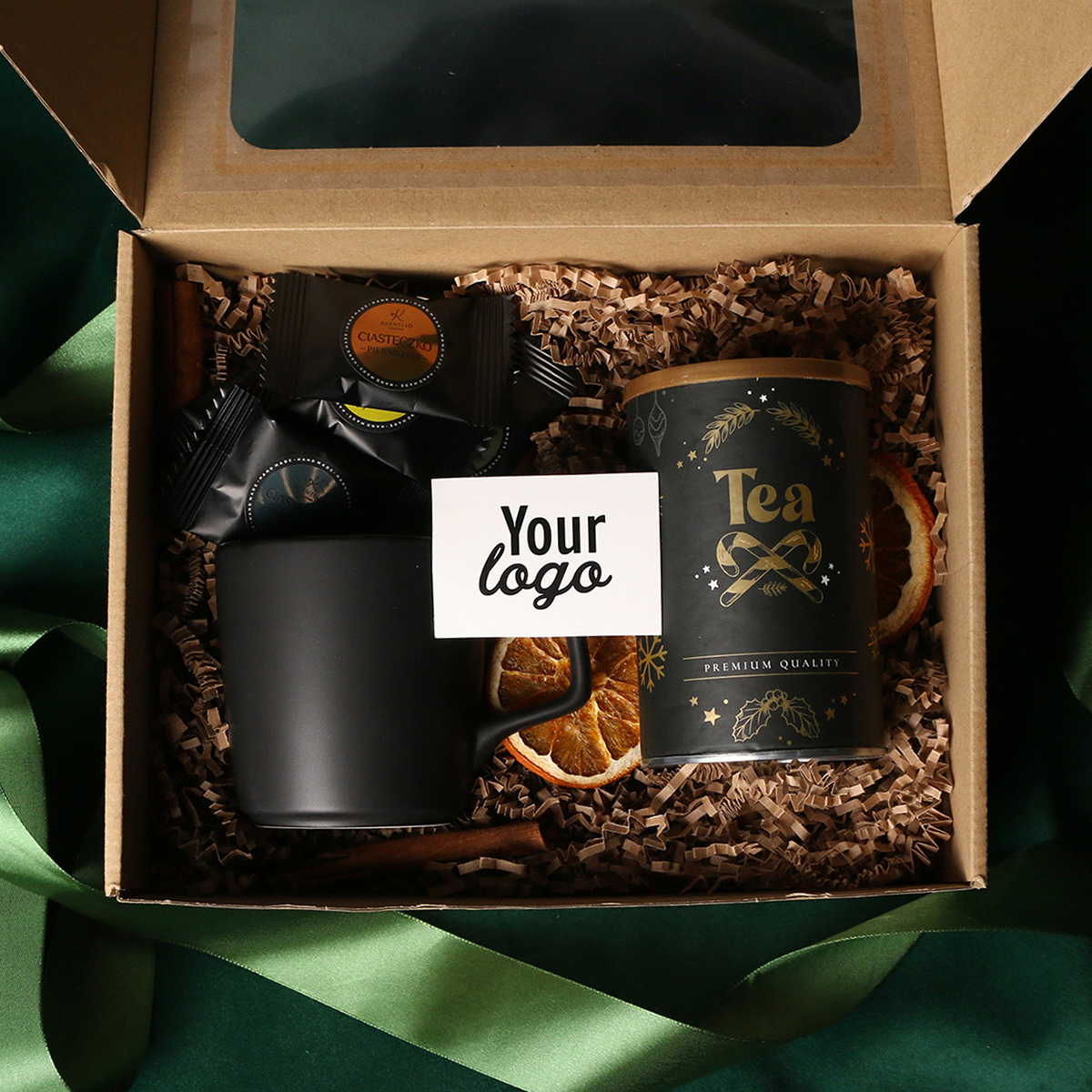 Il set comprende: Tazza Barrel Supreme nero-rosso / nero-blu reflex / nero-nero con possibilità di personalizzazione, tè verde Sencha con ciliegie e petali di rosa confezionato in un tubo con motivo invernale, 8 cioccolatini – mix di gusti. Il tutto confezionato in un elegante astuccio in cartone eco con finestra. Opzioni di personalizzazione aggiuntive: stampa sulla tazza, bigliettino con logo aziendale, nastro o fascetta con motivo invernale arricchito da dettagli dorati.