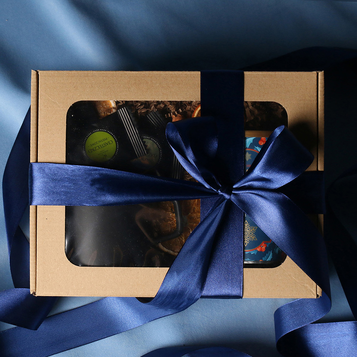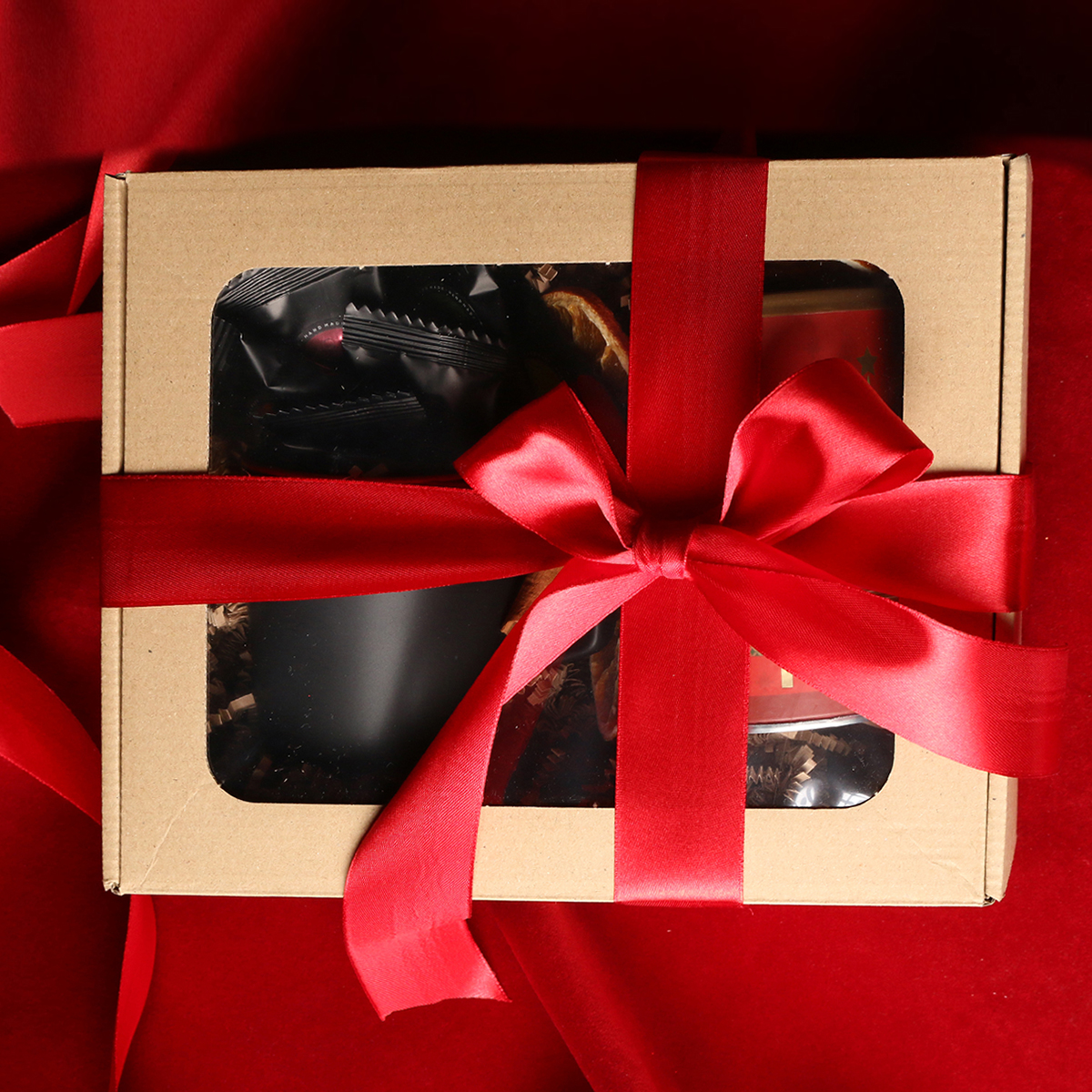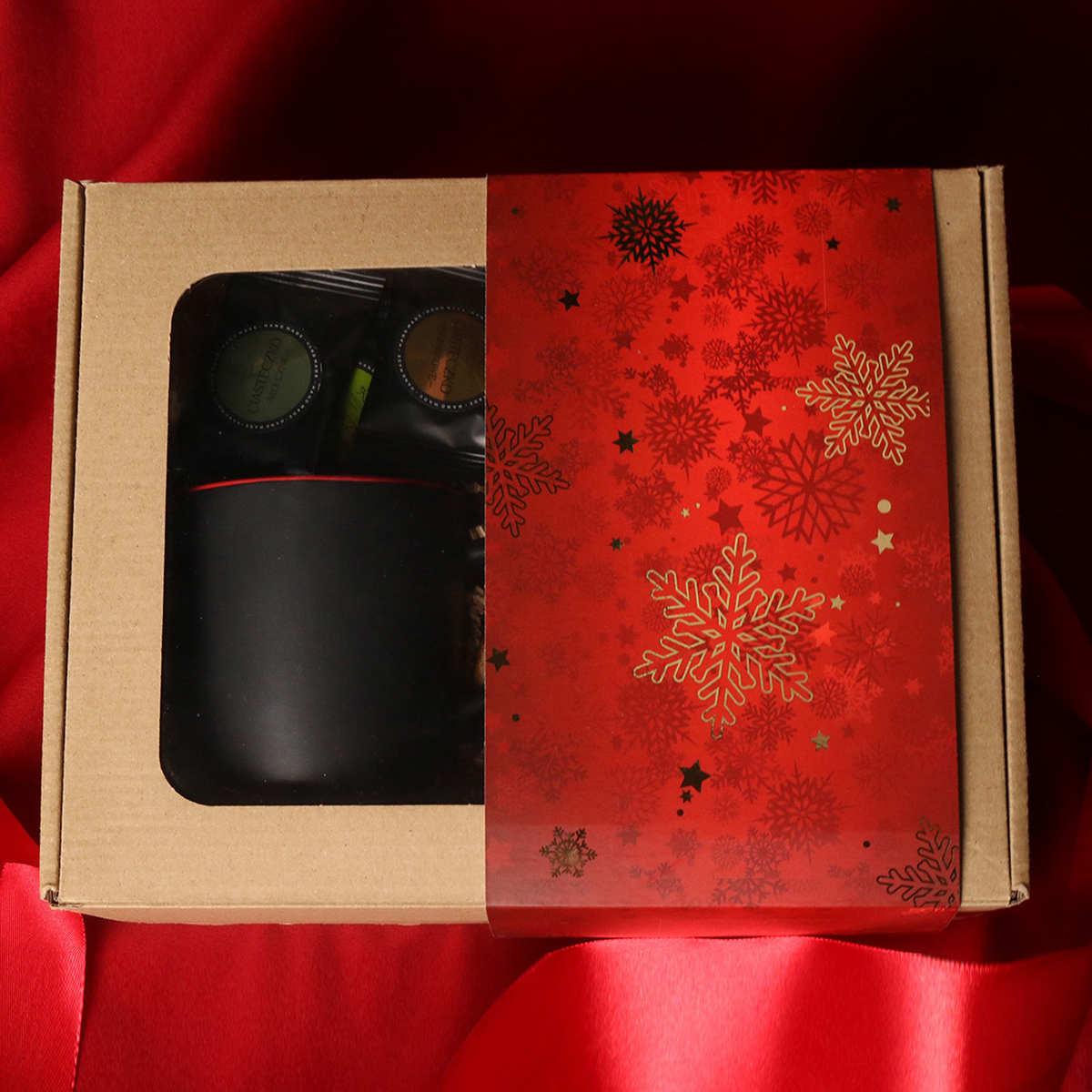 Il set comprende: Tazza Barrel Supreme nero-rosso / nero-blu reflex / nero-nero con possibilità di personalizzazione, tè verde Sencha con ciliegie e petali di rosa confezionato in un tubo con motivo invernale, 8 cioccolatini – mix di gusti. Il tutto confezionato in un elegante astuccio in cartone eco con finestra. Opzioni di personalizzazione aggiuntive: stampa sulla tazza, bigliettino con logo aziendale, nastro o fascetta con motivo invernale arricchito da dettagli dorati.