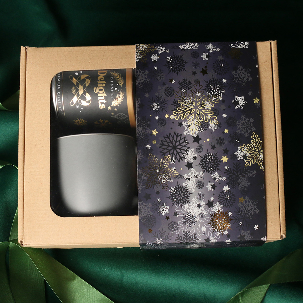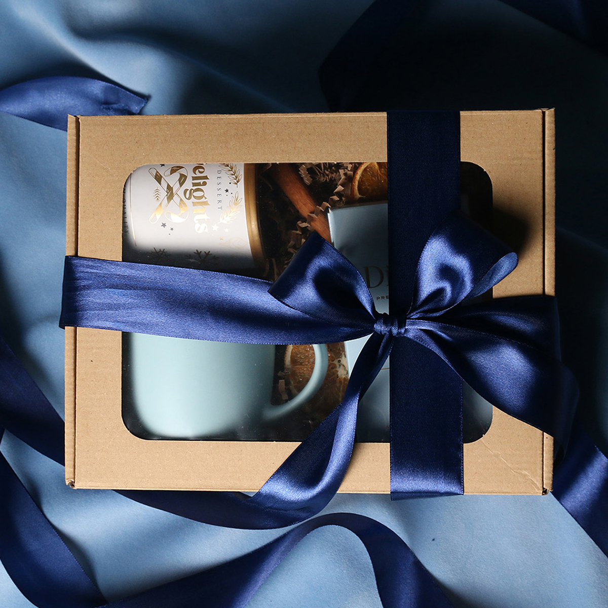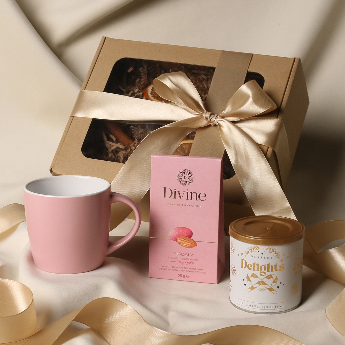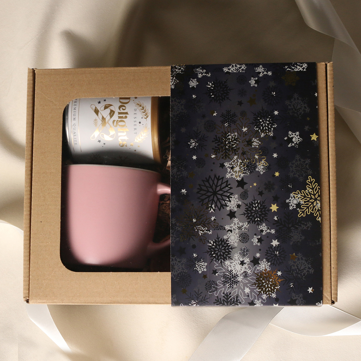 Il set comprende: Tazza Handy Velvet rosa pink-bianco / azzurro baby-bianco / Handy Cool grigio-bianco con possibilità di personalizzazione, Divine Pralines – mandorle al cioccolato con polvere di lampone (rosa) / mandorle al cioccolato con cocco (blu) / scorza d’arancia nel cioccolato fondente (grigio), Dessert Delights – ribes nero nel cioccolato bianco con polvere di lampone, confezionato in un tubo con motivo invernale. Il tutto confezionato in un elegante astuccio in cartone eco con finestra. Opzioni di personalizzazione aggiuntive: stampa sulla tazza, bigliettino con logo aziendale, nastro o fascetta con motivo invernale arricchito da dettagli dorati.